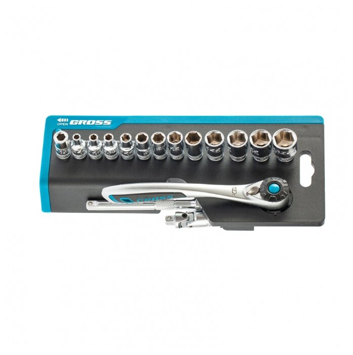Наборы инструмента GROSS разработаны специально для автолюбителей и центров технического обслуживания. Головки и комбинированные ключи изготовлены из хромованадиевой стали, придающей инструменту исключительную твердость в сочетании с легкостью. Набор комплектуется трещотками с реверсом и быстрым сбросом, трещоточный механизм имеет 120 зуба и обеспечивает исключительную мягкость и плавность в работе. Шаг зуба 3 град. Все наборы упакованы в кейс. Наборы инструмента GROSS пригодятся вам не только в автомобиле. С их помощью можно проводить бытовой ремонт дома и на даче, ремонт бытовых конструкций и садовой техники. Набор предназначен для слесарно-монтажных работ. Состав набора: Ключ трещоточный 1/4" Удлинитель 100 мм 1/4" Головки торцевые 1 /4": 4, 4.5, 5, 6, 7, 8, 9, 10, 11, 12, 13, 14 мм Адаптер для бит 1/4" Шарнир карданный 1/4" Биты 1/4": PH1, PH2, PH3, PZ1, PZ2, SL4, SL5.5, SL7, H3, H4, H5, H6, H7, H8, T8, T10, T15, T20, T25, T30.