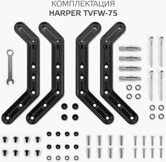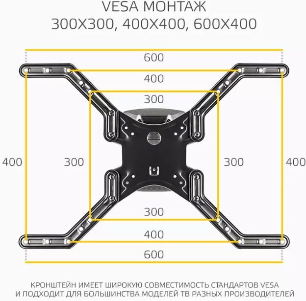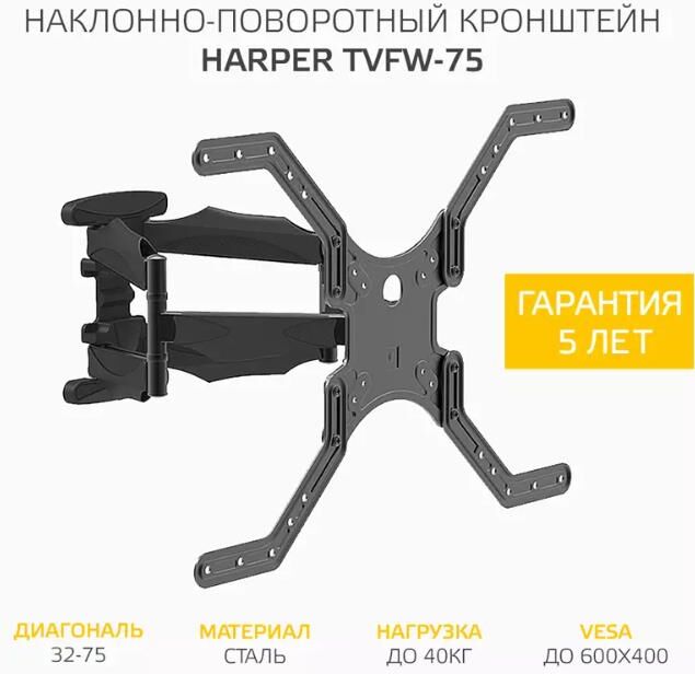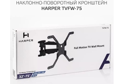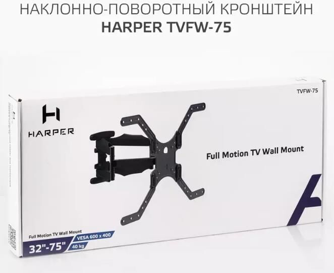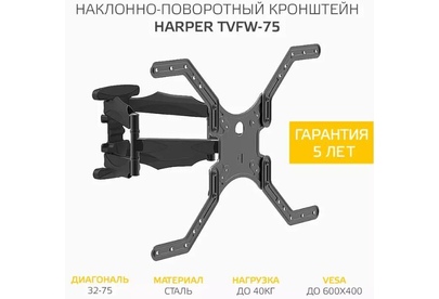 Наклонно-поворотный подвес для телевизоров HARPER TVFW-75. Назначение: для LCD- и LED-телевизоров; Тип кронштейна: наклонно-поворотный; Совместимость: поддерживает ТВ с диагональю 32-75; Максимальный вес ТВ: 40 кг.; Крепление стандарта Vesa: до 600х400; Типы VESA: 100x100/200x100/200x200/300x300/400x400/600x400; Угол наклона: -12°+2°; Масштабирование по горизонтали: да; Масштабирование по вертикали: да; Материал корпуса: сталь, пластик; Цвет: черный; Вес: 3.4 кг.; Размеры (ШхВхГ): 635x345x450 мм.; Минимальное расстояние от стены: 45 мм.; Максимальное расстояние от стены: 450 мм.; Гарантия: 12 мес.; Страна производитель: Китай; Комплектация: Кронштейн, крепежные детали, инструкция, гарантийный талон.