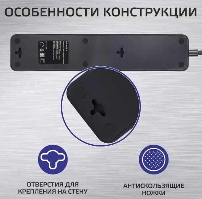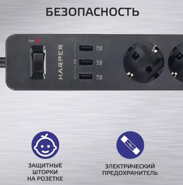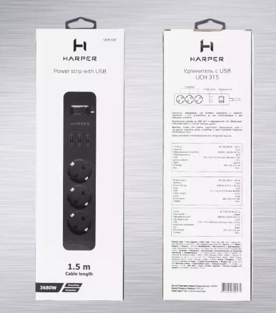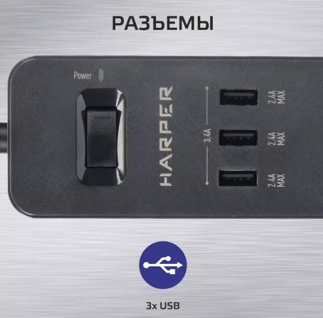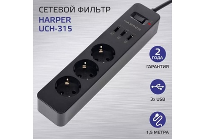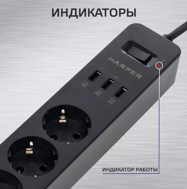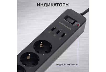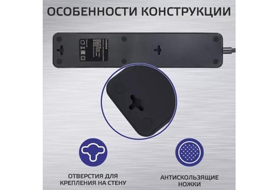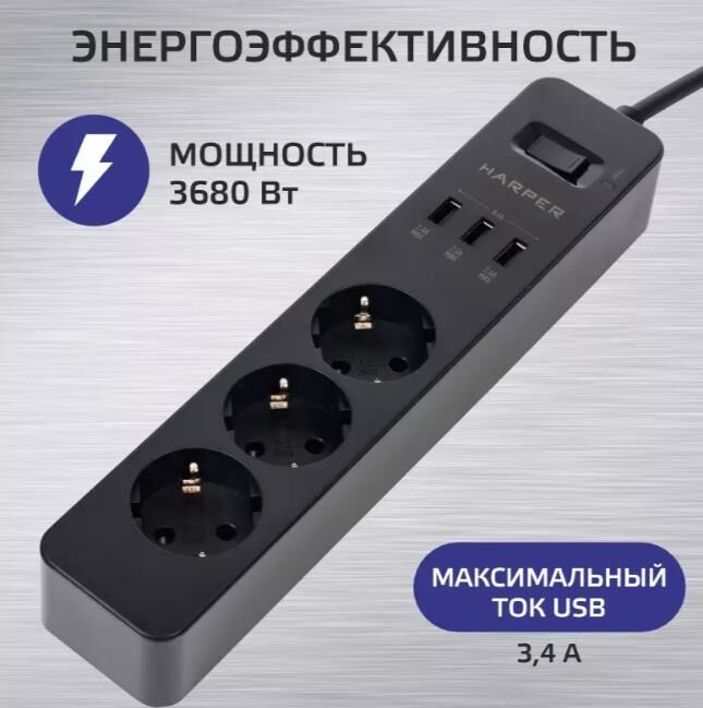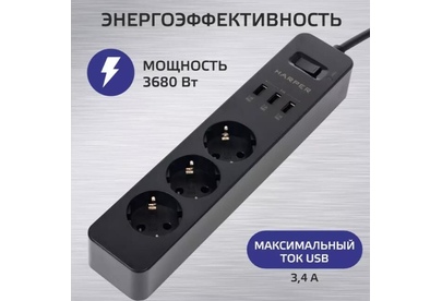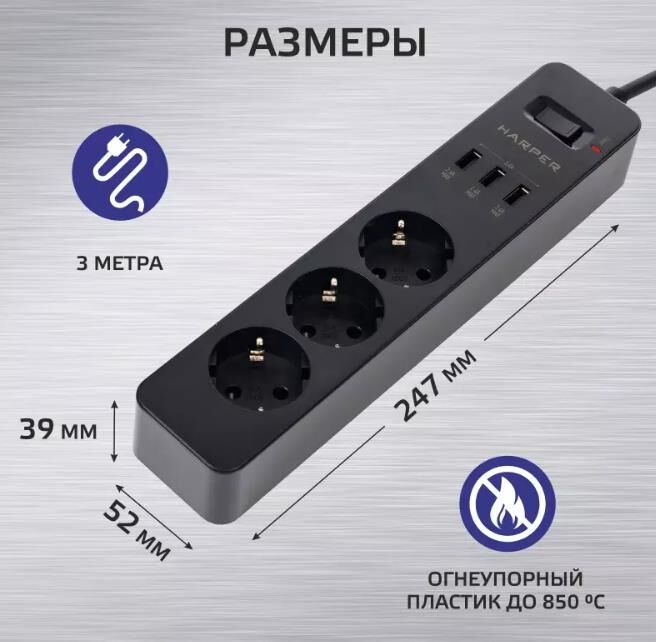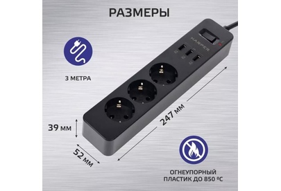 Сетевой фильтр с 3 x USB портами; Розетки 3шт; Длина кабеля 1.5 метра; Максимальная мощность 3680W (16A); 3xUSB (Максимальная сила тока на 1 USB порт: 3.4 А); Защитные шторки, Индикатор заземления, Индикатор работы; Стильный лаконичный дизайн; Высококачественный пластик; Питание AC 220-250V 50Hz. Вес: 380 гр.; Габариты 247х39х52 мм.