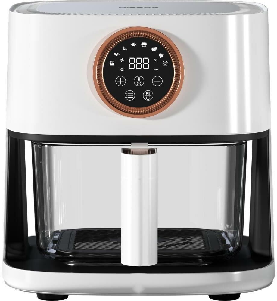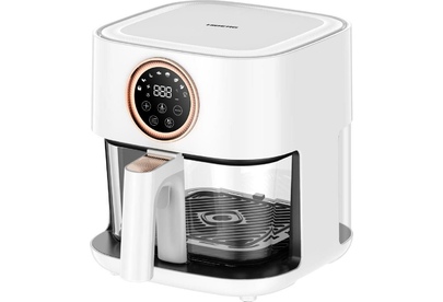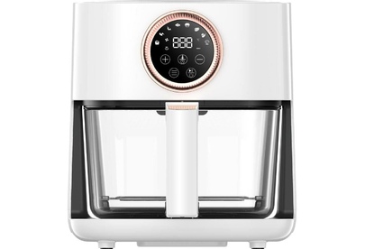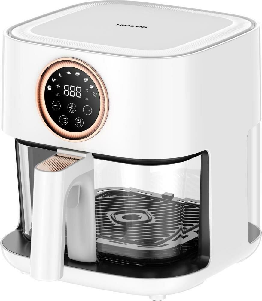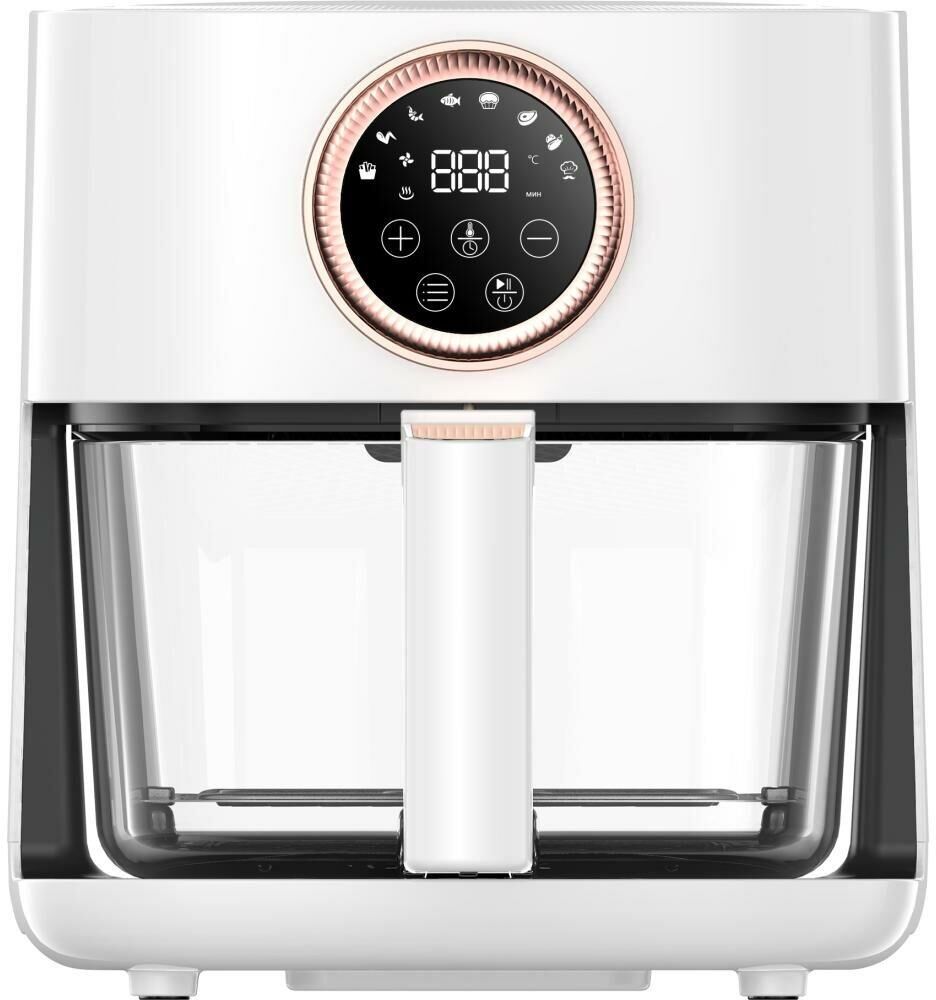 Аэрогриль с AC мотором, Объем: 4 л, Управление: сенсорное, Цветной дисплей, 8 автоматических программ, Специальная программа «МУЛЬТИПОВАР», Прозрачная стеклянная съемная чаша с обзором 360 градусов, Антипригарное покрытие чаши, Мощность 1400 Вт. Цвет- бе