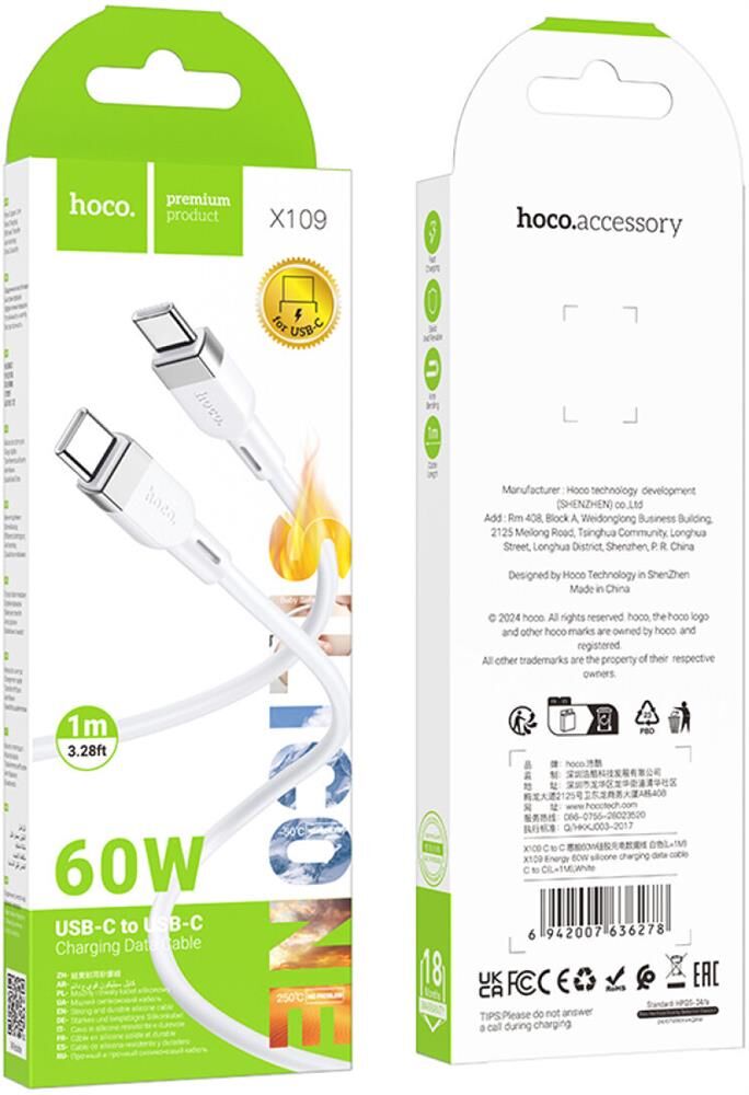 HOCO (6942007636278) X109 USB 3.0A 60W для Type-C Type-C White 1 м