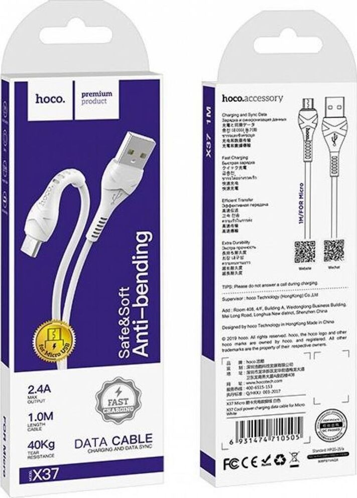 HOCO X37 "Cool Power" USB-microUSB 2.4A 1M белый