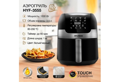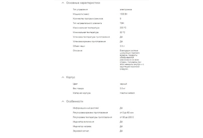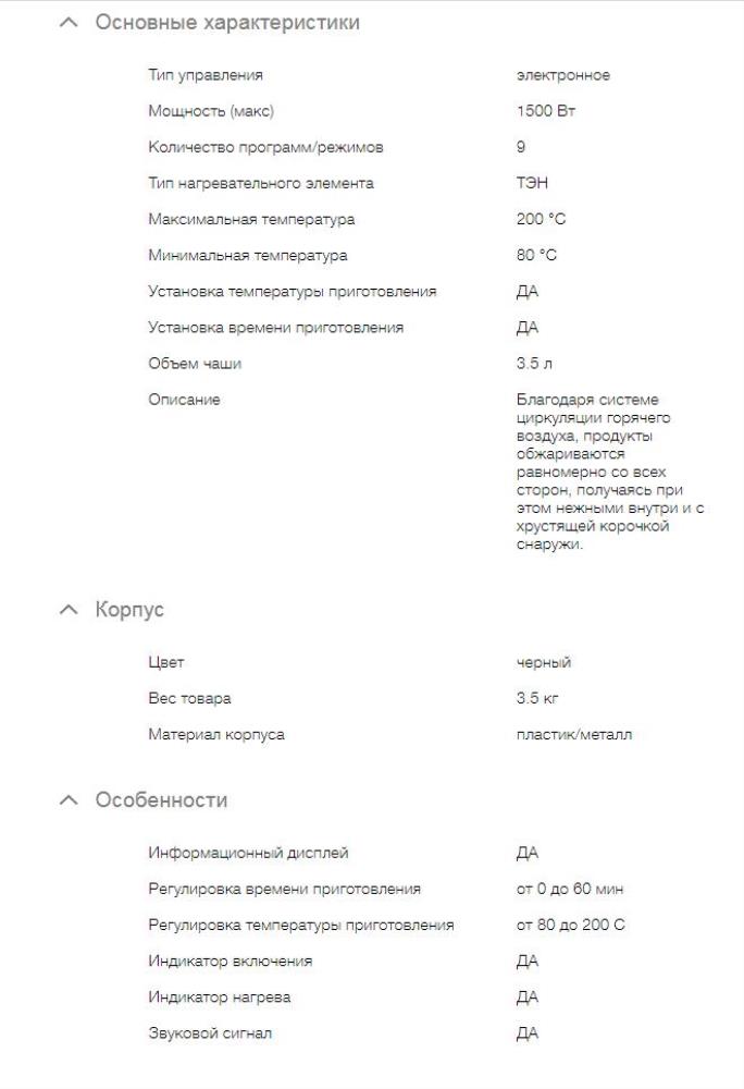 Тип управления электронное Мощность (макс) 1500 Вт Количество программ / режимов 8 Тип нагревательного элемента ТЭН Максимальная температура 200 °С Минимальная температура 80 °С Установка температуры приготовления Установка времени приготовления Объем чаши 3.5 л Цвет черный Вес 3.5 кг Материал корпуса пластик/металл Информационный дисплей Регулировка времени приготовления от 0 до 60 мин Регулировка температуры приготовления от 80 до 200 С Индикатор включения Индикатор нагрева Звуковой сигнал Срок гарантии 24 мес.