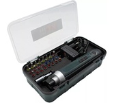 Профессиональная аккумуляторная отвертка с зарядным устройством KLPRO KLNM3820 Скорость холостого хода 290 об/мин Li-ion аккумуляторная батарея 3,6 В / 2,0 Ач Максимальный крутящий момент 5 Нм Емкость патрона 1/4" (6,35 мм) Регулировка крутящего момента 4 Набор аксессуаров из 25 предметов Пластиковая сумка для переноски.
