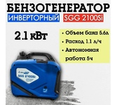Тип генератора: однофазный. Тип преобразователя сети: инвертор. Коэффициент мощности: 1. Вольтметр: есть. Защита от перегрузки выходной сети: есть. Защита по перегреву обмоток: есть. Модель двигателя: SC460. Количество цилиндров: 1. Объем топливного бака: 5.6. Датчик уровня топлива: есть. Расход топлива: 1.1. Объем масляного картера: 0.4. Защита по уровню масла: есть. Ручной старт: есть. Счетчик моточасов: есть. Класс защиты: IP23. Уровень шума: 56. Защита глушителя: есть. Вес товара: 20. Особенности: Переносной генератор 1,9 кВт - пригодится на даче, в походе, на рыбалке. Бензогенератор инверторный SGG 2100Si в шумопоглощающем кожухе, предназначен для подключения к нему потребителей тока общей максимальной мощностью до 2,1 кВт.. Альтернатор: Синхронный. Комплектация: Электрическая вилка, свечной ключ, воронка, DC 12B, разъем для паралельной работы.. Мощность двигателя: 3. Обмотка альтернатора: медь. Тип кожуха: Закрытый. Тип топлива: АИ-92. Габариты упаковки (ед) ДхШхВ: 0.55x0.35x0.515. Вес упаковки (ед): 21