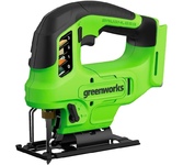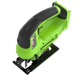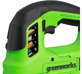 Длина хода: 26. Глубина резания (дерево): 90. Глубина резания (алюминий): 20. Глубина резания (сталь): 10. Маятниковое движение: есть. Тип маятникого движения: 4-х ступенчатое. Регулировка хода колебаний: есть. Регулировка положения опорной плиты: нет. Замена режущего полотна без инструмента: есть. Встроенная подсветка: есть. Встроенный лазерный маркер: нет. Встроенный пылесборник: нет. Возможность подключения пылесоса: нет. Функция сдува опилок: нет. Встроенный отсек для хранения полотен: нет. Противоударный корпус: есть. Жесткий кейс в комплекте: отсутствует. Особенности: Максимум электронных помощников: плавный пуск, защита от перегрева / перегрузки – всегда точная, безопасная и комфортная работа лобзиком GD24JS90. Длина инструмента: 220. Высота инструмента: 220. Вес товара: 2. Комплект поставки: Лобзик аккумуляторный Greenworks GD24JS90; Руководство по эксплуатации; Полотно по дереву – 1 шт; Шестигранный ключ - 1 шт; Гарантийный талон; Картонная коробка.. Тип электропитания: от аккумулятора. Напряжение ак
