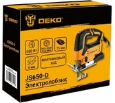 Электролобзик DEKO JS650-D предназначен для распиливания дерева, металла, пластика, резины при отделочных или ремонтных работах. Технические характеристики: Напряжение: 220 В Частота: 50 Гц Мощность: 650 Вт Число ходов: 800-3000 ход/мин Диапазон наклона резки: ±45° Макс. глубина реза дерева: 75 мм Макс. глубина реза металла: 6 мм Маятниковый ход: да Быстрозажимной патрон: да