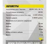 KOLNER KID 600V дрель ударная Напряжение сети, В: 220±10% Частота, Гц: 50 Потребляемая мощность, Вт: 600 Число оборотов на холостом ходу, об/мин: 0-3000 Частота ударов, уд/мин: 0-48000 Режимы работы: сверление/сверление с ударом Патрон: ключевой Максимальный диаметр сверления, мм: дерево-23, бетон-10, сталь-10 Длина сетевого кабеля, м: 2 Масса, кг: 1,7