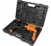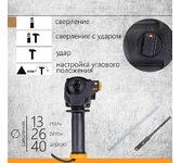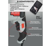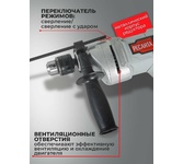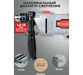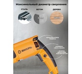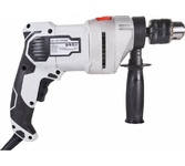 Тип инструмента: ударная. Потребляемая мощность: 850. Количество скоростей: односкоростная. Наличие функции "сверление с ударом": есть. Количество патронов в комплекте: один. Тип основного патрона: ключевой. Максимальный диаметр сверления (сталь): 10. Максимальный диаметр сверления (бетон): 13. Максимальный диаметр сверления (дерево): 25. Наличие функции "реверс": есть. Дополнительная рукоятка: есть. Ограничитель глубины сверления: есть. Особенности: Точная электронная регулировка частоты вращения. Реверс отлично справляется с разблокировкой заклинившего сверла. Выбранный режим безопасно фиксируется посредством специальной кнопки. Рукоятка оснащена мягкой накладкой для более комфортной работы.. Вес инструмента: 2.4. Длина сетевого кабеля: 2. Длина инструмента: 320. Высота инструмента: 210. Комплект поставки: Дрель ударная, вторая рукоять, инструмент для ограничения глубины отверстия, ключ для патрона, руководство по эксплуатации, коробка картонная.. Габариты упаковки (ед) ДхШхВ: 0.3x0.066x0.28. Вес упаковки (