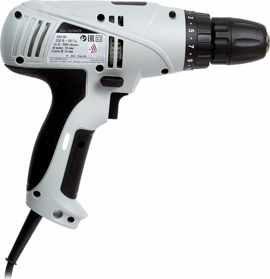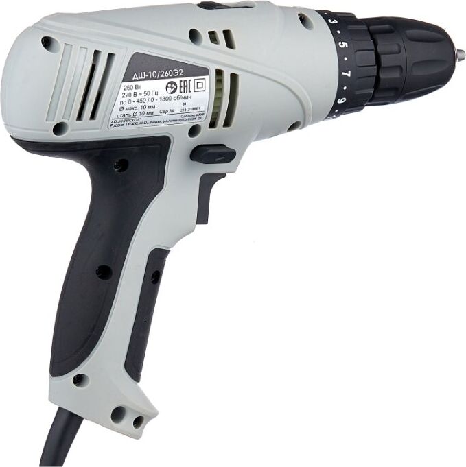 Быстрозажимной патрон. Диаметр зажимаемого сверла, мм: 0,8-10. Диапазон частоты вращения на холостом ходу, об/мин: 0-450/0-1800. Длина шнура питания с вилкой м: 2. Класс безопасности машины (по ГОСТ Р МЭК 60745-1): II. Кол-во диапазонов момента затяжки: 20+1. Масса согласно процедуре EPTA 01/2003, кг, не более: 1,4. Наибольший диаметр завинчиваемых шурупов, мм: 6. Наибольший диаметр сверления в древесине, мм: 25. Наибольший диаметр сверления в стали, мм: 10. Номинальная потребляемая мощность, Вт: 260. Номинальный крутящий момент , Нм: 35. Параметры сети питания, В/Гц: 220 ±10% / 50. Регулировка оборотов. Смена направления вращения.