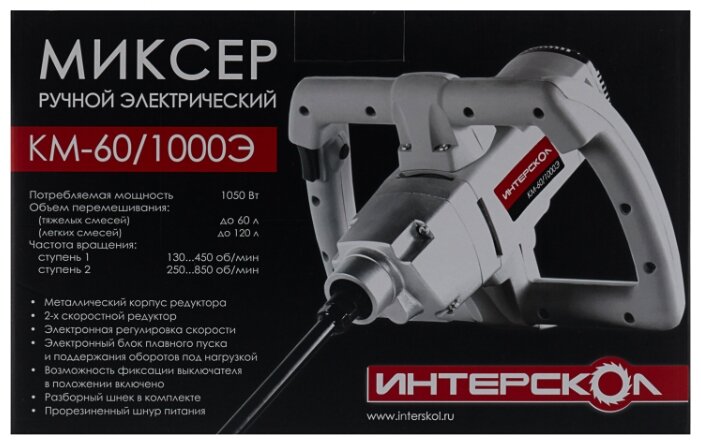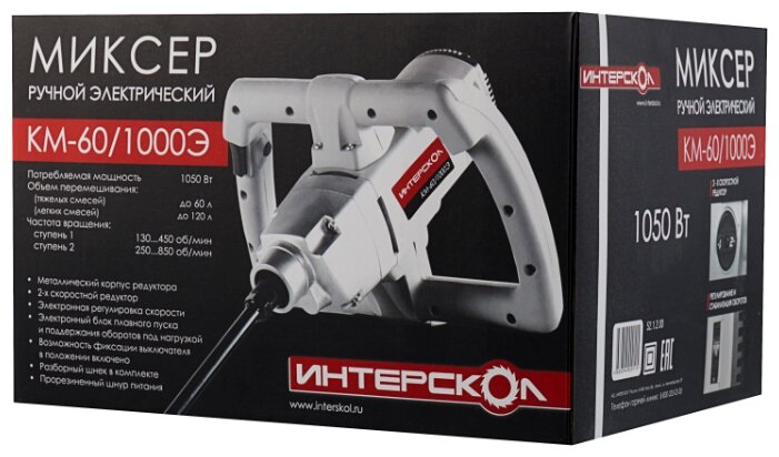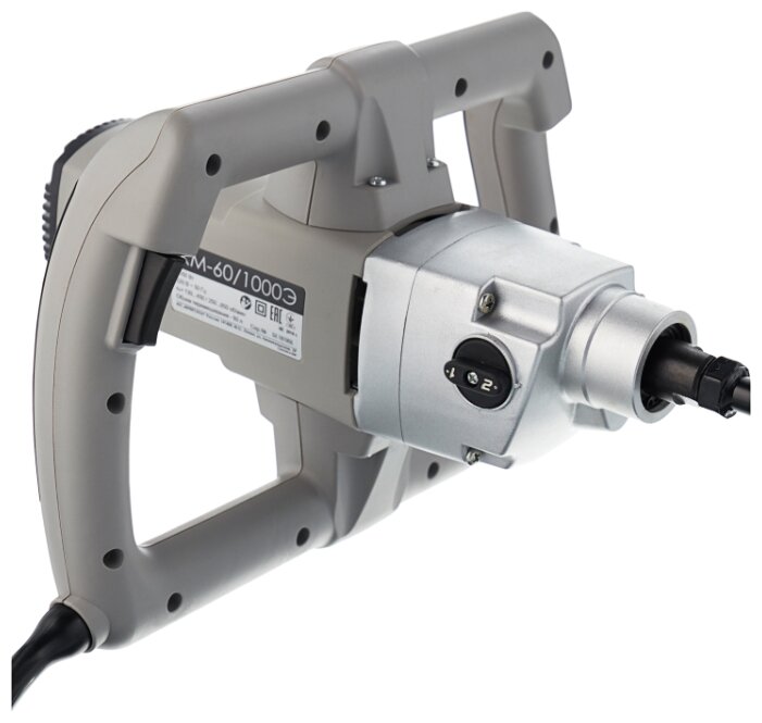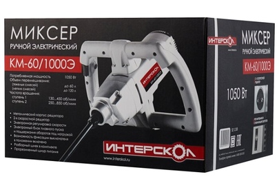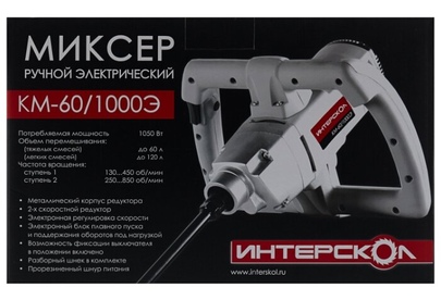 Профессиональный двухскоростной строительный миксер. Параметры сети питания, В/Гц: 220 ±10% / 50, Номинальная потребляемая мощность, Вт: 1050, Частота вращения на холостом ходу, об/мин: 130…450, Частота вращения на холостом ходу - 2ступень, об/мин: 250…850, Максимальный крутящий момент - 1 ступень, Нм: 53, Максимальный крутящий момент - 2 ступень, Нм: 27, Объем смешивания - густые смеси, л: 60, Объем смешивания - жидкие растворы, л: 120, Крепление насадки смесителя: М14, Диаметр шнека, мм: 120, Тип редуктора: 2-х ступенчатый, Электронный блок управления, Класс безопасности машины (по ГОСТ Р МЭК 60745-1): II, Установленный срок службы, лет: 3, Масса, кг: 4,3.