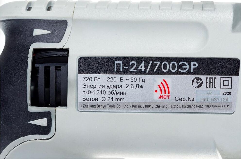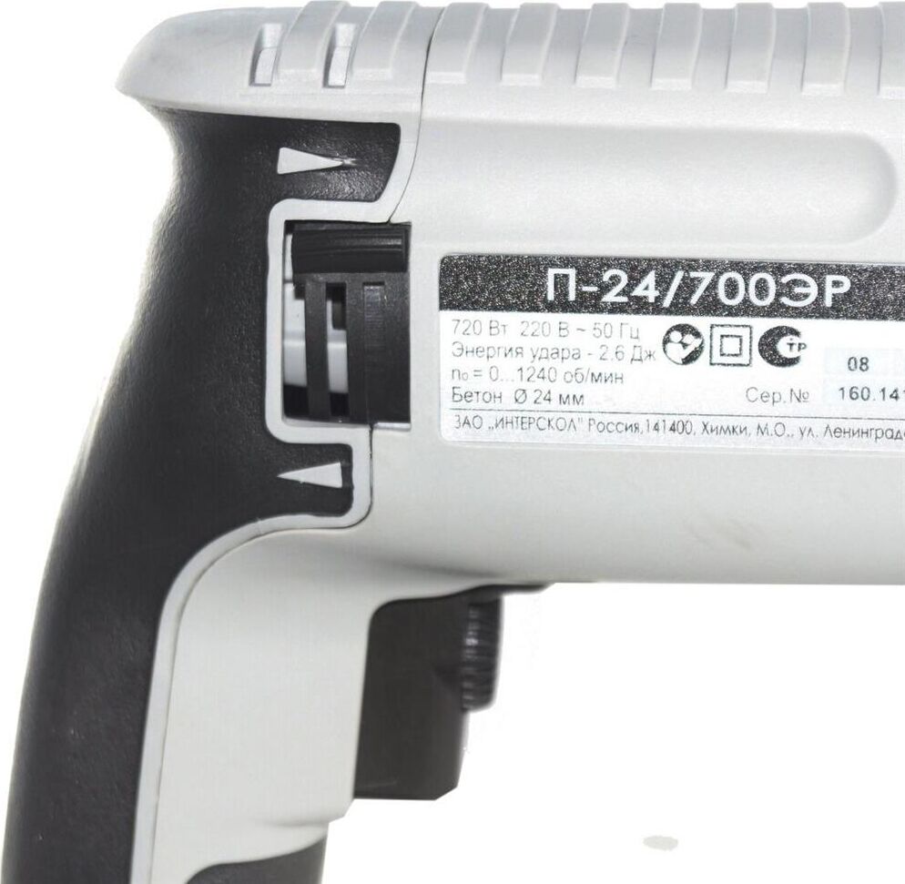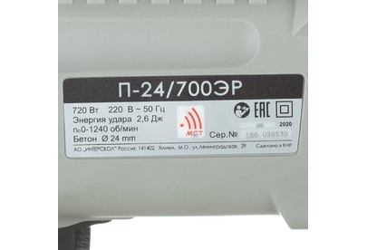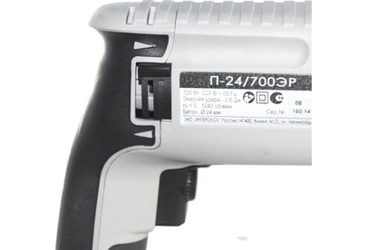 Параметры сети питания, В/Гц: 220±10%/50. Номинальная потребляемая мощность, Вт: 720. Номинальный потребляемый ток, А: 3,3. Частота вращения на холостом ходу, об/мин: 0-1240. Частота ударов на холостом ходу, уд/мин: 0-5080. Номинальная энергия удара, Дж: 2,6. Наибольший диаметр бурения (сверления) в бетоне, мм: 24. Наибольший диаметр бурения (сверления) в стали, мм: 13. Наибольший диаметр бурения (сверления) в древесине, мм: 24. Наибольший диаметр бурения (сверления) коронкой в кирпиче, мм : 68. Возможность регулировки числа оборотов. Изменение направления вращения инструмента. Режим сверления. Режим долбления (без вращения инструмента). Предохранительная муфта. Поддержание оборотов. Предустановка углового положения инструмента. Система крепления инструмента: SDS-Plus. Класс безопасности машины (по ГОСТ Р МЭК 60745-1): II. Масса, кг: 2,9.