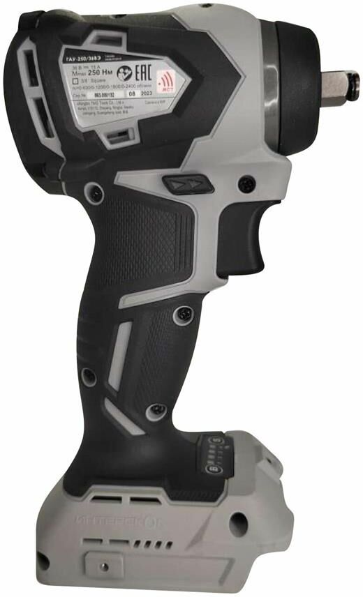 Тип инструмента: Ударный гайковерт. Крутящий момент: 250. Количество скоростей: 4. Тип основного патрона: квадрат 3/8". Тип электропитания: от аккумулятора. Напряжение аккумулятора: 36. Тип аккумулятора: Li-Ion. Жесткий кейс в комплекте: отсутствует. Вес товара: 1.02. Длина инструмента: 134. Высота инструмента: 196. Комплект поставки: Аккумуляторный ударный гайковерт, инструкция по эксплуатации и безопасности, гарантийный талон, список сервисных центров.. Бесщеточный двигатель: да. Аккумулятор: отсутствует, приобретается отдельно. Зарядное устройство: отсутствует, приобретается отдельно. Количество аккумуляторов в комплекте: без аккумулятора. Габариты упаковки (ед) ДхШхВ: 0.2x0.12x0.085. Вес упаковки (ед): 2.62. Страна производства: Китай. Гарантия: 24 мес.. Число оборотов (для 2 скорости): 1200 об/мин. Частота удара: 800 уд/мин. Частота удара (для 2 скорости): 1600 уд/мин. Число оборотов: 600 об/мин. Обороты: 600 об/мин / 1200 об/мин , скоростей 4. Основной патрон: квадрат 3/8". Крутящий момент: 250 Н*м. Бат
