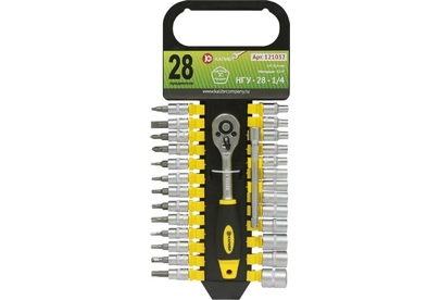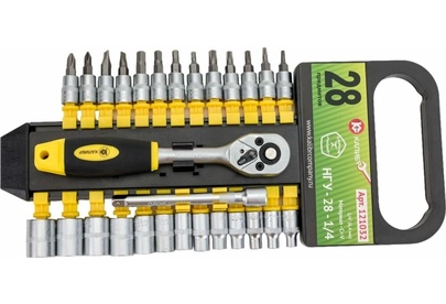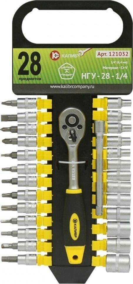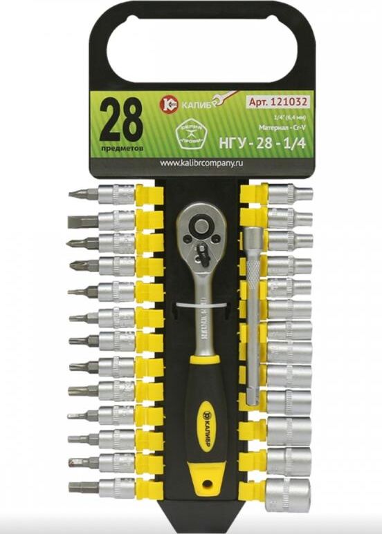 Набор головок универсальных с ключом-трещоткой Калибр НГУ-28-1/4 (артикул 121032) содержит 28 предметов и предназначен для работ в автомастерских и для индивидуального применения. Все инструменты выполнены из хромванадиевой стали со специальным покрытием для защиты от коррозии. В набор входит: Трещотка 1 шт. Головки торцевые 4/4,5/5/5,5/6/7/8/9/10/11/12/13/14мм 13 шт. Биты T10,T15,T20,T25,T30,HEX H3,H4,H5,H6,SL5.5,SL7,PH1,PH2 13 шт. Удлинитель 100 мм 1 шт.