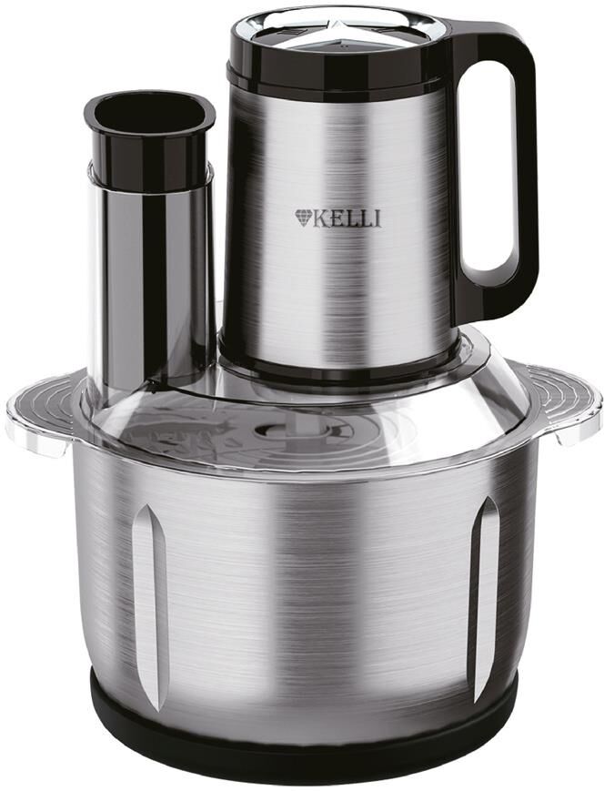 Чоппер-измельчитель 5в1 Мощность: 1500Вт Металлическая чаша: 2,8л 3 скоростных режима Двухъярусный нож с 4-мя лезвиями Насадки: диск-терка двусторонняя, насадка для взбивания яиц, насадка для замешивания теста, насадка для очистки чеснока Противоскользящее основание Ножи из нержавеющей стали Механическое основание Сеть: 220-240В, 50Гц