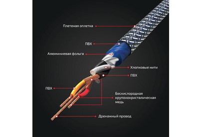 Профессиональный межблочный 4-х канальный кабель с проводником из чистой бескислородной меди защищенной тройной модифицированной изоляцией позволяет без потерь передавать сигнал от источника к усилителю. Кабель имеет направленую схему построения, что необходимо учесть во время проектирования и инсталляции. Подключение дренажного провода к массе автомобиля, дополнительно экранирует кабель и защищает сигнал от воздействия электромагнитных волн возникающих в бортовой сети автомобиля. Надежный контакт обеспечивается стальными коннекторами с высокопроводным никелированным покрытием. Полиэстеровая оплетка (змея) дополнительно защищает от механических воздействий.