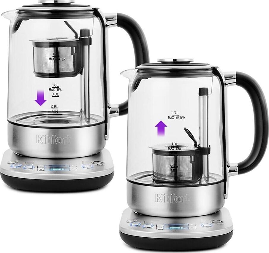 Мощность: 2200. Максимальный объем: 1.7. Нагревательный элемент: скрытый. Цвет: нержавеющая сталь. Температурные режимы: 6. Особенности: В чайнике установлено 5 режимов популярных сортов чая: чёрный, зелёный, белый, травяной и улун; и 3 типа крепости заваривания: крепкий, средний и светлый. С помощью ручного режима, вы сможете задать нужную температуру и время заваривания чая на ваш вкус. Автоматический чаезаварочный механизм.. Габариты упаковки (ед) ДхШхВ: 0.25x0.2x0.32. Вес упаковки (ед): 2.85. Материал корпуса: стекло/металл/пластик. Индикация: включения, уровня воды. Безопасность: автоотключение, защита от включения без воды. Конструктивные особенности: дисплей, заварочный чайник, подставка 360, фильтр от накипи. Дополнительные функции: поддержание температуры, регулировка температуры нагрева, таймер. Объем: 1.7 л. Мощность: 2200 Вт. Нагревательный элемент: скрытый. Материал корпуса: стекло/металл/пластик