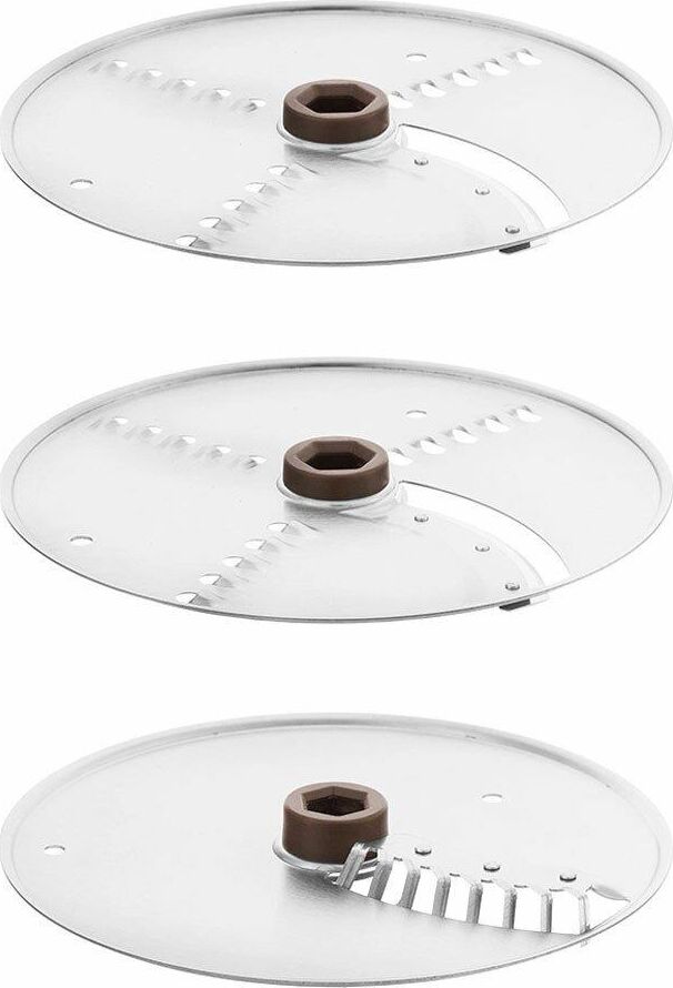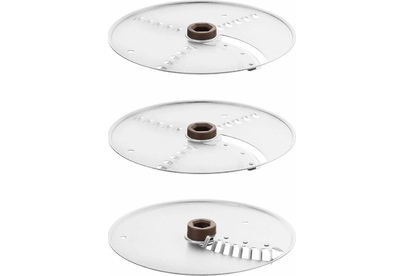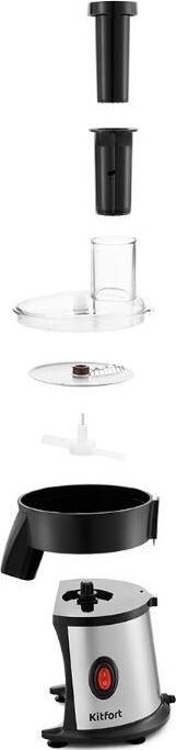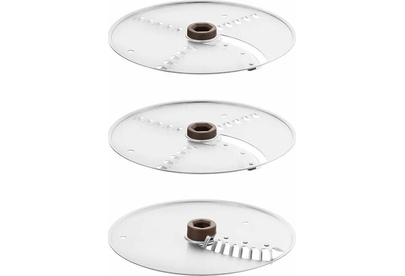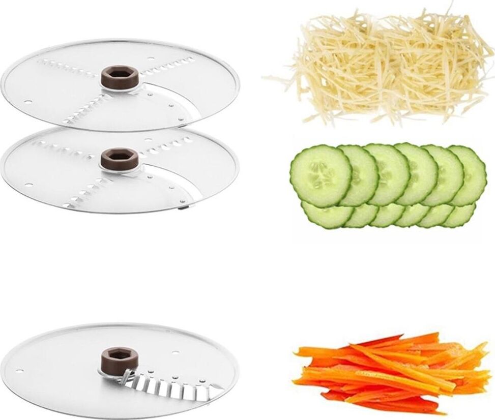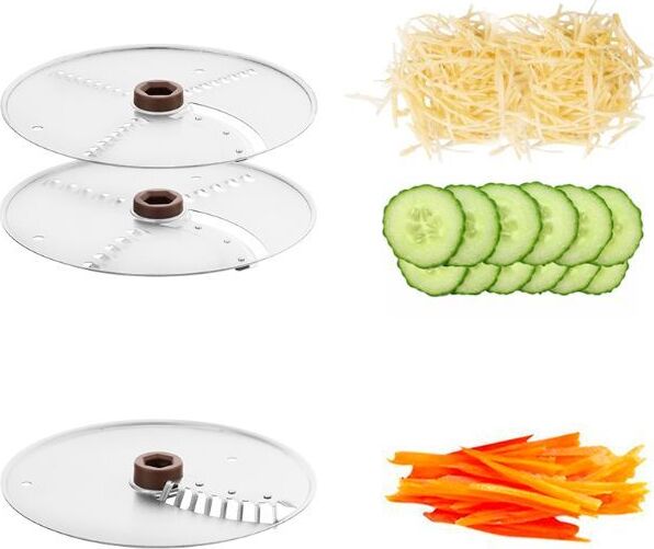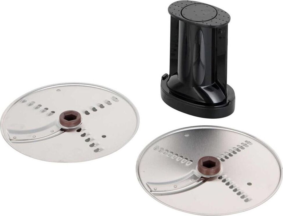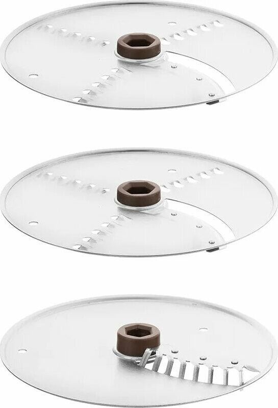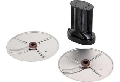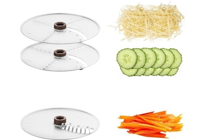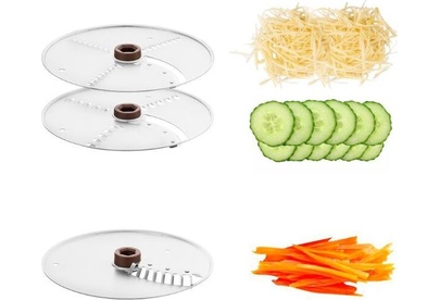 - моторный блок,< br/> - чаша,< br/> - лопасть,< br/> - нож для нарезки соломкой,< br/> - нож 2 в 1 (терка+шинковка) - 2 шт,< br/> - крышка,< br/> - толкатель 2 в 1 (тонкий толкатель + проставка толкателя).