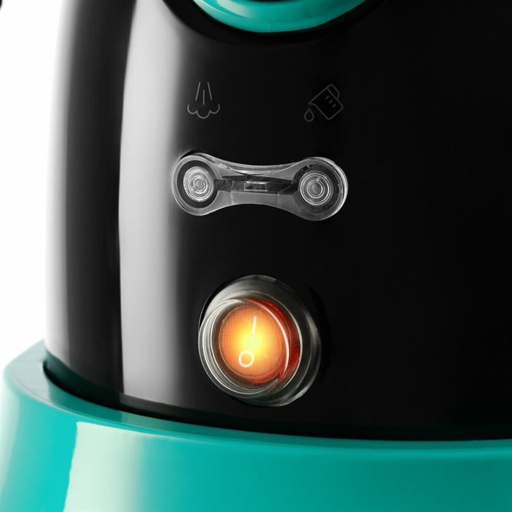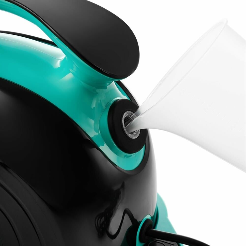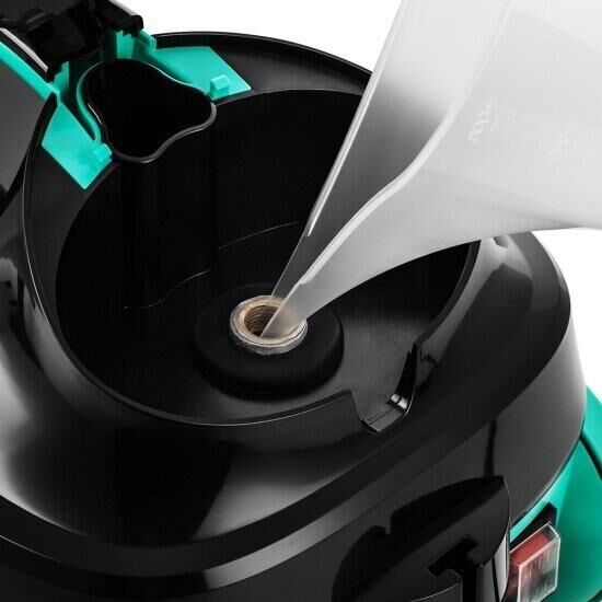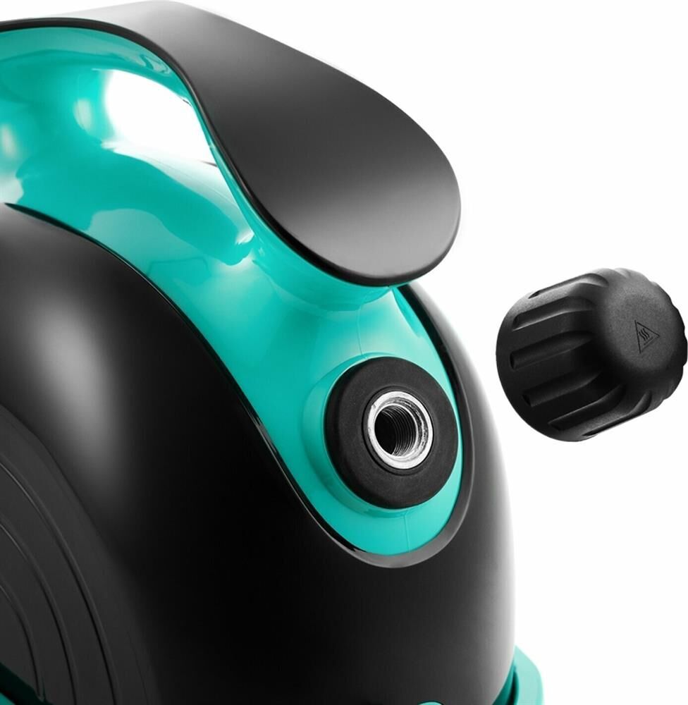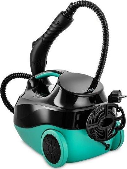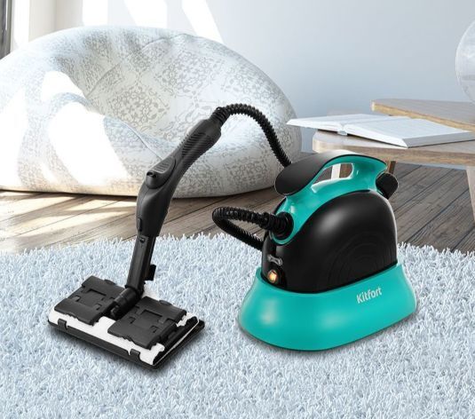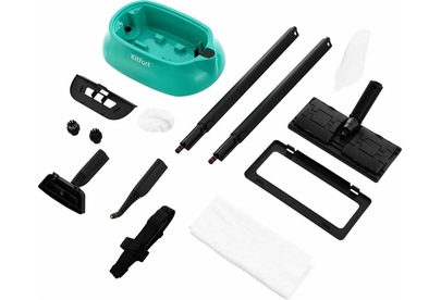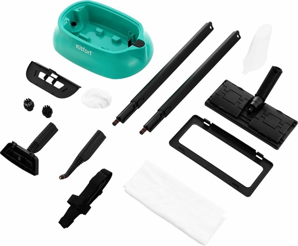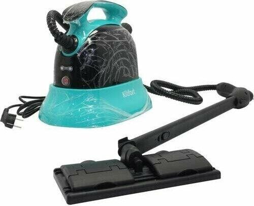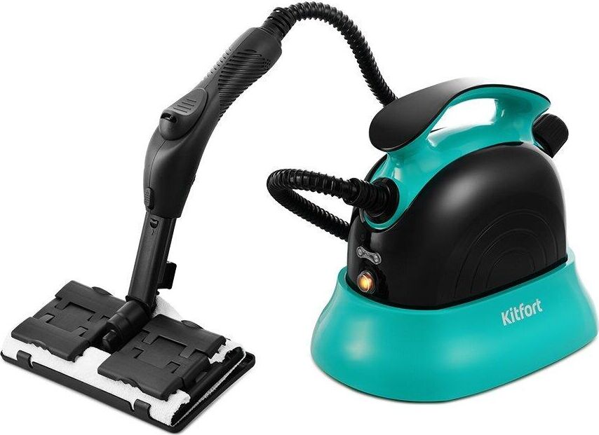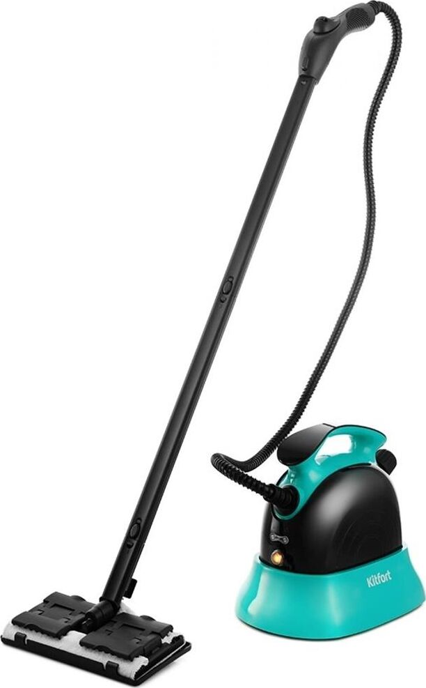 Пароочиститель напольный Kitfort КТ-9102-3 1500Вт черный/бирюзовый Kitfort КТ-9102 способен заменить паровую швабру, дезинфектор, стеклоочиститель, отпариватель. Горячий пар под давлением в 4 бара очищает разные поверхности, удаляет жир, известковые отложения, убивает патогенные микроорганизмы, отпаривает ткани. Мощность нагревателя 1500 Вт Максимальное давление пара 4 Бар Время нагревания 6 мин Емкость первого бака для воды 1.1 л Регулятор расхода пара на рукоятке пистолета Длина парового шланга 1.4 м Паровой пистолет есть Форсунка для мытья окон есть Насадки в комплекте Скребок для стекла используется для чистки окон, зеркал, кафеля. Струйная насадка подходит для чистки плинтусов, щелей и других углов. Щётки - для удаления стойких загрязнений. С тряпкой можно отпаривать одежду, шторы, мягкую мебель. И это далеко не всё! Принадлежности в комплекте В комплект, помимо различных насадок, входят также щётка для пола, тряпка, рамка для чистки ковров, удлинительные трубки, что делает КТ