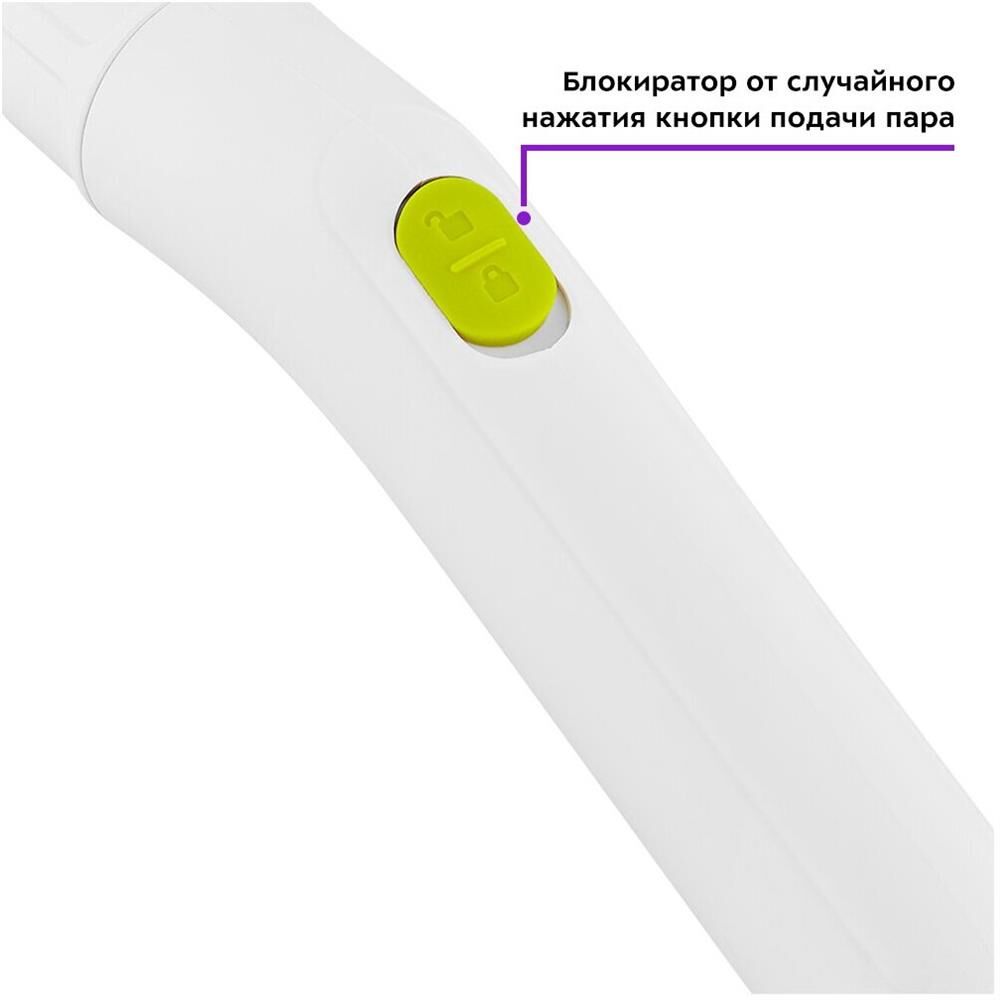 Мощность нагревателя: 1000. Максимальное давление пара: 3. Время нагревания: 5. Максимальное количество пара: 25. Количество баков для воды: 1. Емкость первого бака для воды: 0.3. Регулятор расхода пара: отсутствует. Длина парового шланга: 1.2. Форсунка точечной струи: есть. Круглая щетка: есть. Вес (без принадлежностей): 1.9. Паровой пистолет: есть. Индикация наличия воды в баке: есть. Насадки в комплекте: Струйная насадка, угловая насадка, круглая ворсовая щетка, круглая латунная щетка, овальная насадка.. Принадлежности в комплекте: Скребок с резиновой вставкой, насадки из микрофибры 2шт., кувшин и воронка для добавления воды.. Вид пароочистителя: Ручной. Габариты упаковки (ед) ДхШхВ: 0.31x0.2x0.211. Вес упаковки (ед): 2.6. Гарантия: 12 мес.. Размер (ДхШхВ): 132 х 168 х 285 мм. Цвет: белый/салатовый. Регулятор пара: отсутствует. Мощность: 1000 Вт. В комплекте: паровой пистолет, форсунка точечной струи, круглая щетка. Давление пара: 3 Бар. Производительность пара: 25 г/мин. Длина парового шланга: 1.2 м