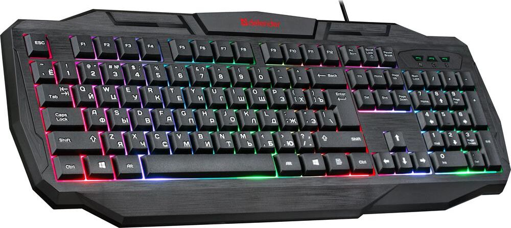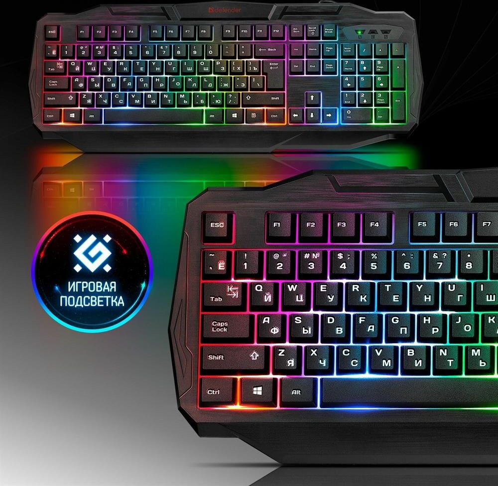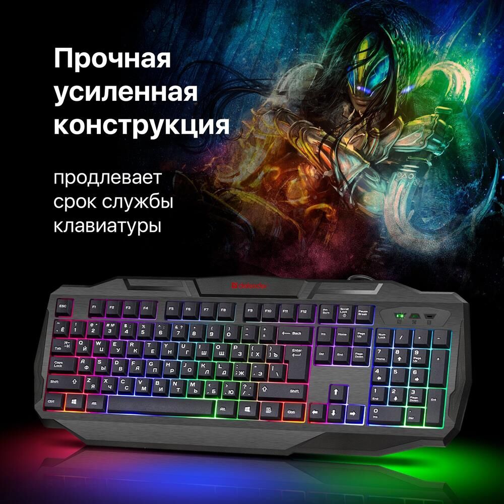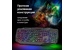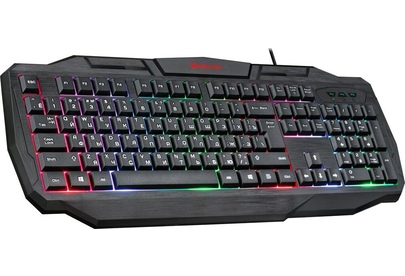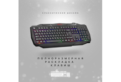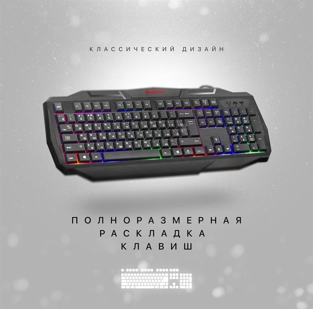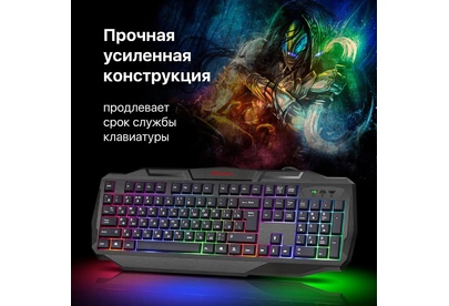 Системные требования для ПК Windows 2000/XP/Vista/7/8/10, Mac OS X10.Цвет языка основной раскладки белый. Прочная усиленная конструкция продлевает срок службы клавиатуры. Полноразмерная раскладка клавиш. Легкая установка. Для работы не нужны драйверы. Радужная подсветка. Возможность выключения подсветки. Угол наклона клавиатуры регулируется с помощью ножек. Многофункциональное программное обеспечение.