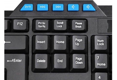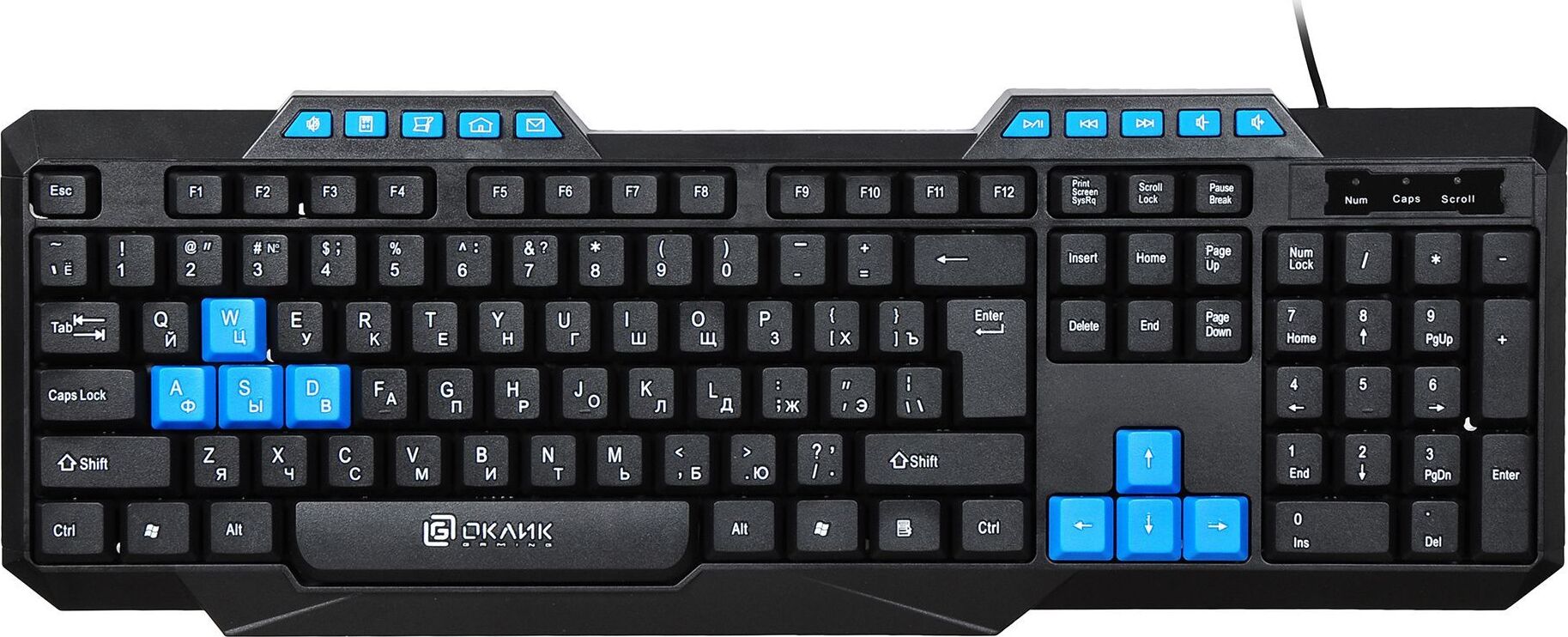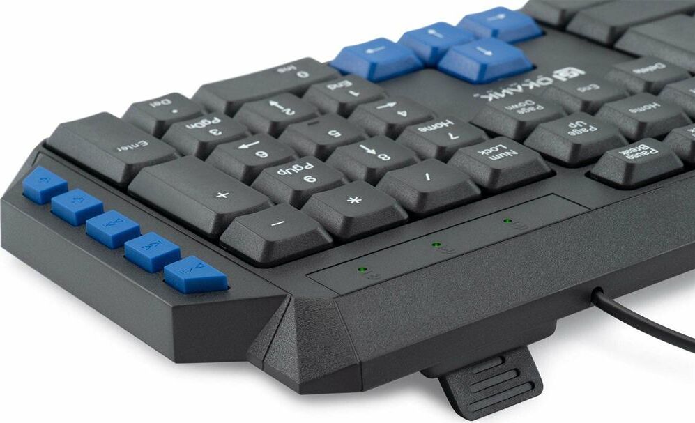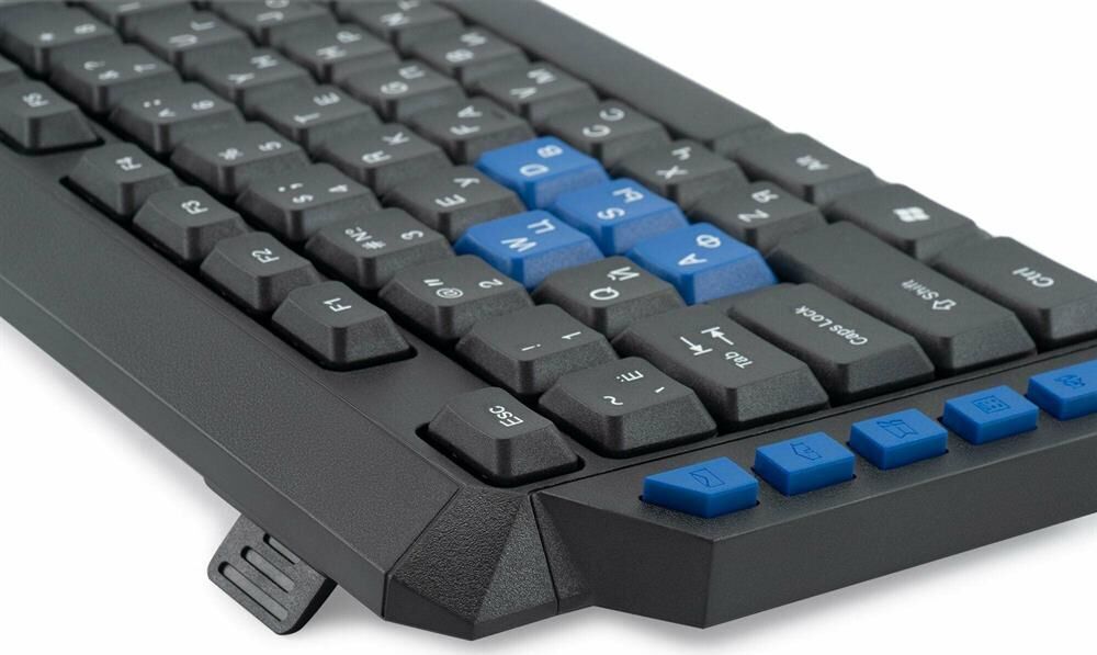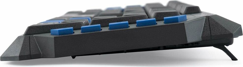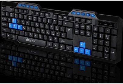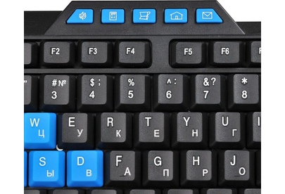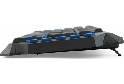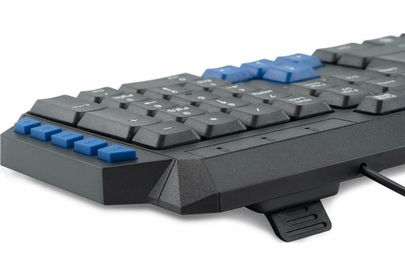 Клавиатура игровая, проводная, мультимедийная, количество клавиш: 114, дополнительных - 10, часто используемые клавиши - выделены голубым цветом, интерфейс USB, корпус клавиатуры - имеет изогнутую форму, ножки прорезинены, длина кабеля: 1,5 м, размер: 450 x 155 x 25 мм.
