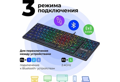 Ультратонкий дизайн 3 режима подключения - Проводное подключение, беспроводной режим Bluetooth, беспроводное подключение по радио каналу 2.4 ГГц Высокая энергоэффективность Тихий ход клавиш обеспечивает практически бесшумную работу Повышенная износостойкость Позолоченный USB-коннектор - Позолоченное напыление обеспечивает лучшую проводимость, меньшее сопротивление и окисляемость RGB подсветка Индикатор заряда аккумулятора Встроенный аккумулятор Совместимость с ПК, ноутбуками, игровыми консолями, смартфонами, планшетами