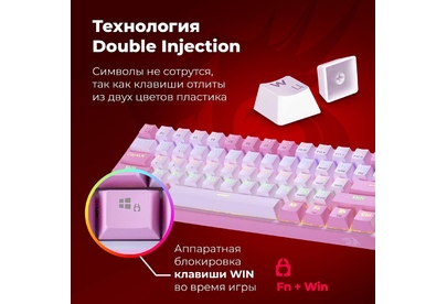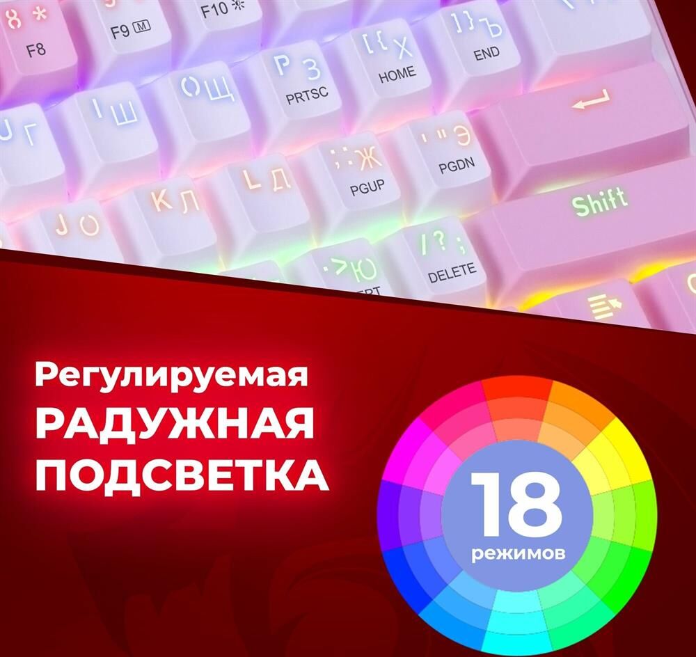 Повышенная износостойкость Позолоченный USB-коннектор - Позолоченное напыление обеспечивает лучшую проводимость, меньшее сопротивление и окисляемость Радужная подсветка Технология Hot Swap Влагоустойчивая конструкция клавиатуры Тихий ход клавиш обеспечивает практически бесшумную работу