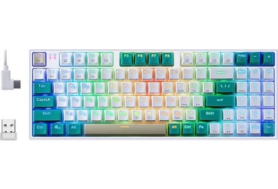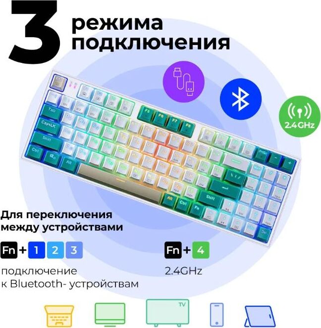 Клавиатура, Тип подключения беспроводной Bluetooth, беспроводной радио. Количество клавиш 94 . Количество нажатий 50 миллионов . Цвет белый + зелёный. Длина кабеля 1.5 ±5% м. Совместимость Windows 2000/XP/Vista/7/8/10 и выше, Mac OS X10 Тип элемента питания Li-polymer. Емкость батареи 1600 мА. Время работы от аккумулятора 10-80.