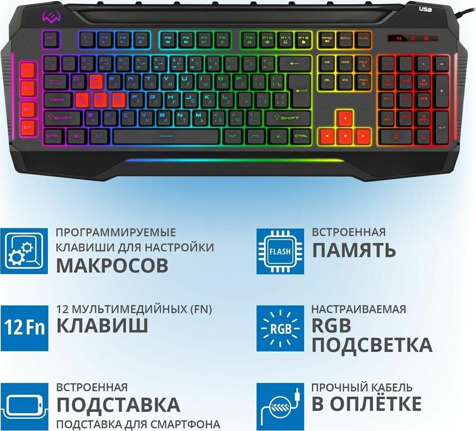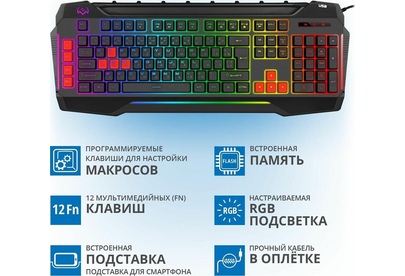Программируемые клавиши для настройки макросов 12 мультимедийных (Fn) клавиш Совместимость с ОС Windows Раскладка клавиатуры Рус/Укр/Eng Раскладка кириллицы Windows Количество клавиш 109 Кол-во клавиш быстрого доступа, шт. 12 Интерфейс USB Наработка на отказ, нажатий свыше 20 000 000 Тип мембранная Соответствие стандартам FCC, CE, ЕАС Настраиваемая RGB-подсветка Встроенная подставка для смартфона