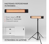 Мощность, Вт 2000 Площадь обогрева, м2 20 Параметры электросети, В/Гц 220-240/50 Степень защиты IP34 Класс электрозащиты I Размер изделия (без штатива), см 86,5х9х19 Вес, кг 2,75
