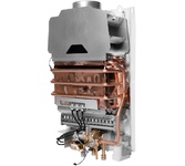 Номинальная мощность 21 кВт. Коэффициент полезного действия 84%. Расход воды при нагреве на 25°С 11 л/мин. Минимальный проток воды для работы 2,5 л/мин. Количество точек водоразбора 1-2. Напряжение сети 220В, 50Гц. Потребление электричества при работе 50Вт. Вертикальный монтаж на стену с нижней подводкой. Размеры (ВxШxГ) 610x340x180 мм. Электронное зажигание. Светодиодный дисплей.