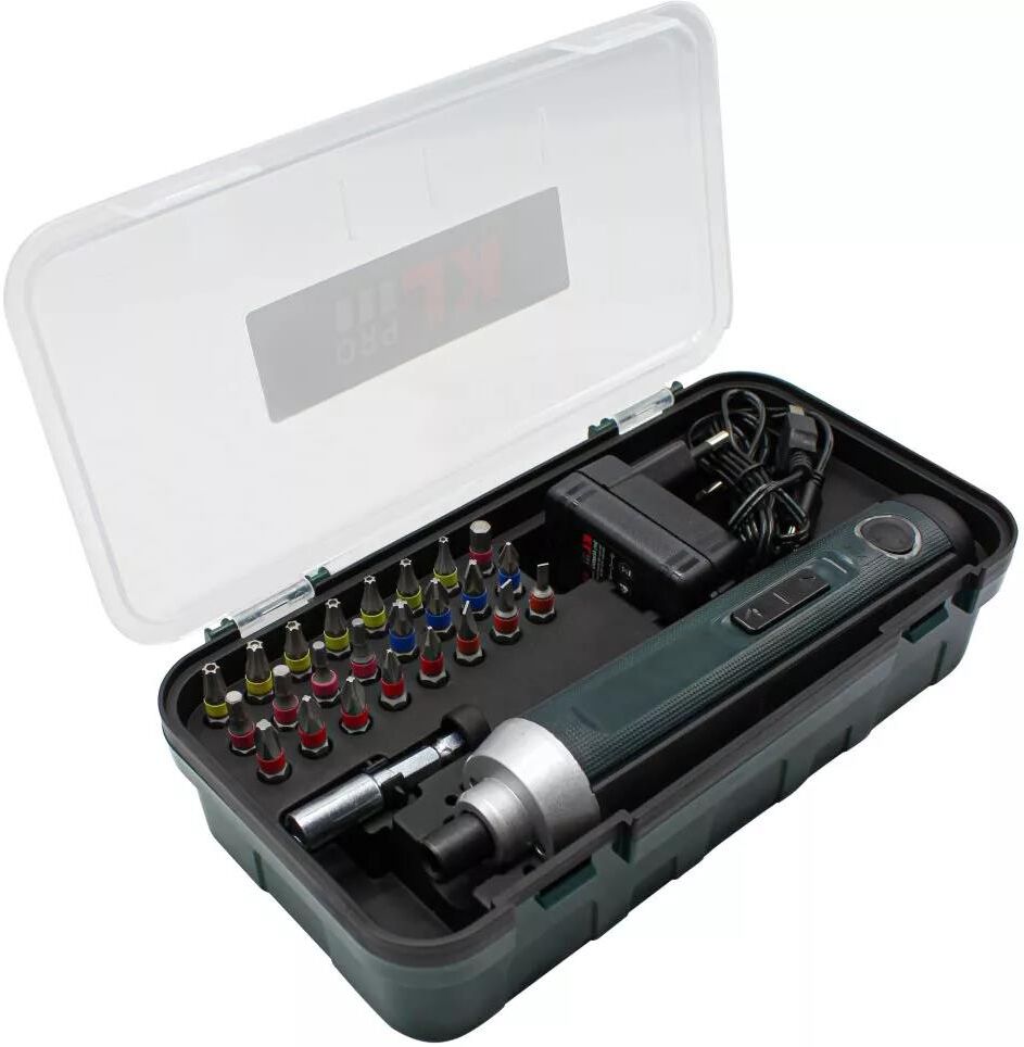Профессиональная аккумуляторная отвертка с зарядным устройством KLPRO KLNM3820 Скорость холостого хода 290 об/мин Li-ion аккумуляторная батарея 3,6 В / 2,0 Ач Максимальный крутящий момент 5 Нм Емкость патрона 1/4" (6,35 мм) Регулировка крутящего момента 4 Набор аксессуаров из 25 предметов Пластиковая сумка для переноски.