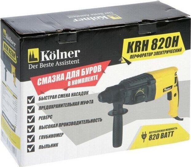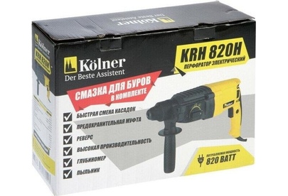 Перфоратор KOLNER KRH 820H: Напряжение/частота: 220 В ± 10%/50 Гц. Потребляемая мощность: 820 Вт. Энергия удара: 2,5 Дж. Число оборотов на холостом ходу: 0-1300 об/мин. Частота ударов: 0-5500 уд/мин. Режим работы: сверление/ сверление с ударом/долбление. Патрон: SDS-plus. Максимальный диаметр сверления: дерево - 38 мм, бетон - 26 мм, металл - 13 мм. Длина сетевого кабеля: 2 метра. Масса: 3,1 кг.