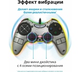 Проводной геймпад, 12 функциональных кнопок, 2 аналоговых джойстика, 2 мини джойстика позволяют играть в дополнительные игры, например, в футбольные симуляторы, 8-позиционный переключатель видов, эффект вибрации - делает аварии и столкновения более реали