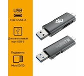 Тип устройства: внешний. Цвет: серый. Количество слотов для карт памяти: 2. Интерфейс подключения: Type C. Разъемов 3.5 мм (наушники): 2. Поддерживаемые ОС: Win7 / Win8 / Win10 / Linux 2.4 посл. версии, Mac OS 10 и выше. Материал: алюминий. Вес товара: 43. Длина кабеля: 15. Габариты упаковки (ед) ДхШхВ: 0.16x0.12x0.021. Вес упаковки (ед): 0.08. Гарантия: 12 мес.. Размеры (ШхВхГ): 65х35х12 мм. Форматы карты памяти: SD, TF, micro-SD. Тип: внешний. Размеры (ШхВхГ): 65х35х12 мм. Интерфейс подключения: Type C. Поддержка: SD, TF, micro-SD. Количество слотов для карт памяти: 2