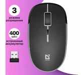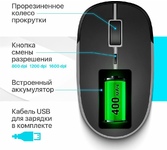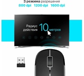 Мышь беспроводная, износостойкое UV-покрытие с эффектом Metallic; бесшумные клавиши; подходит для использования как правой, так и левой рукой; 3 уровня DPI: 800, 1200, 1600; радиус действия - до 10 м; 1 батарейка АА в комплекте.