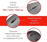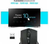 USB, разрешение 800/1200/1600 dpi, 5 + колесо-кнопка, кнопка смены разрешения позволяет менять скорость курсора мыши одним нажатием, радиус действия - до 10 метров