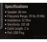 Гарнитура игровая, диапазон воспроизводимых частот: 20 - 20 000 Гц, чувствительность наушников: -96±4дБ, сопротивление наушников: 24±15% Ом, чувствительность микрофона: - 58±3дБ, сопротивление микрофона: 2.2 кОм, разъемы подключения: 2 x 3.5 мм (джек), 1 x USB, гибкий микрофон, регулируемое оголовье, регулятор громкости на кабеле, кабель - 2.5 метра.