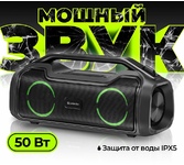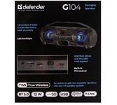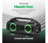 Акустика, суммарная выходная мощность (RMS): 50 Вт Звуковая схема: стерео, 2.0 Диаметр НЧ динамика: 2 x 3,5 " Акустическое оформление: с пассивным излучателем True Wireless Stereo (TWS): есть Диапазон частот: 80–12000 Гц Соотношение сигнал/шум: 85 дБ Влагозащищенный корпус: IPX5 Время работы от аккумулятора: 4 час Время зарядки аккумулятора: 5-9 час Интерфейс: AUX-аудиовход Подсветка: светодиодная Интерфейс беспроводной связи: Bluetooth 5.0 Дальность действия: 10 м Питание: от USB, 5 В, Li-Ion аккумулятор Емкость аккумулятора: 3600 мА·ч Тип элементов питания: 18650 Поддержка карт памяти Micro-SD: есть Максимальный поддерживаемый объем карты памяти MicroSD: 32 ГБ Форматы воспроизведения аудио: WAV, FLAC, MP3, WMA, APE Встроенный пассивный излучатель: есть Материал корпуса: пластик Размеры без упаковки: 13.0 x 17.5 x 39.0 см Размеры индивидуальной упаковки: 16.3 x 19.0 x 42.5 см Гарантийный срок: 6 месяцев Цвет: чёрный ROHS / CE: Да