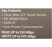 скорость чтения, до: 450МБ/с; скорость записи, до: 350МБ/с; толщина — 7мм; интерфейс: SATA III; тип памяти: 3D NAND; форм-фактор: 2.5"