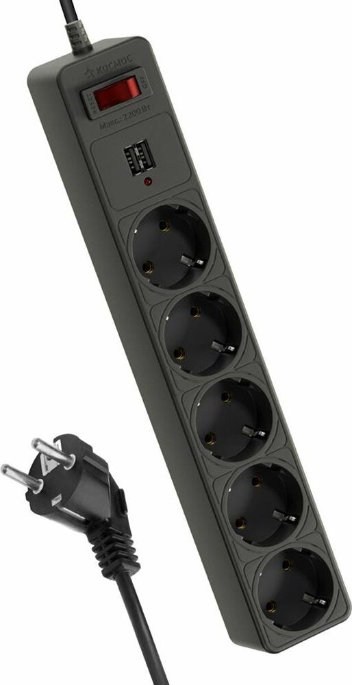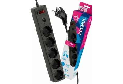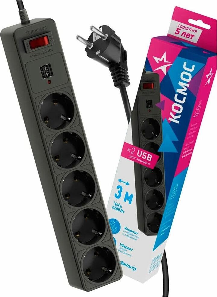 Сетевой фильтр(варистор,терморазмыкатель),3м, на 5 гнезд с заземлением, сечения провода - 3*0,75мм2,Медь 100%,Индикатор сети. Номинальный ток 10А, максимальная мощность - 2200Вт.