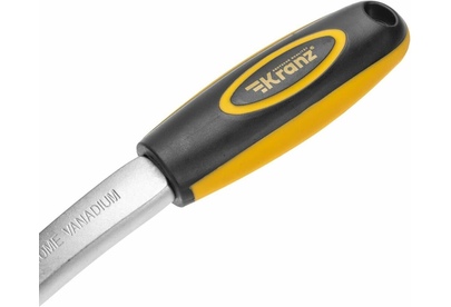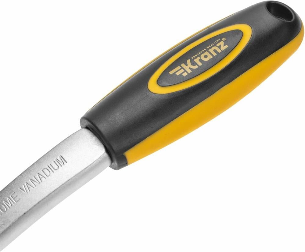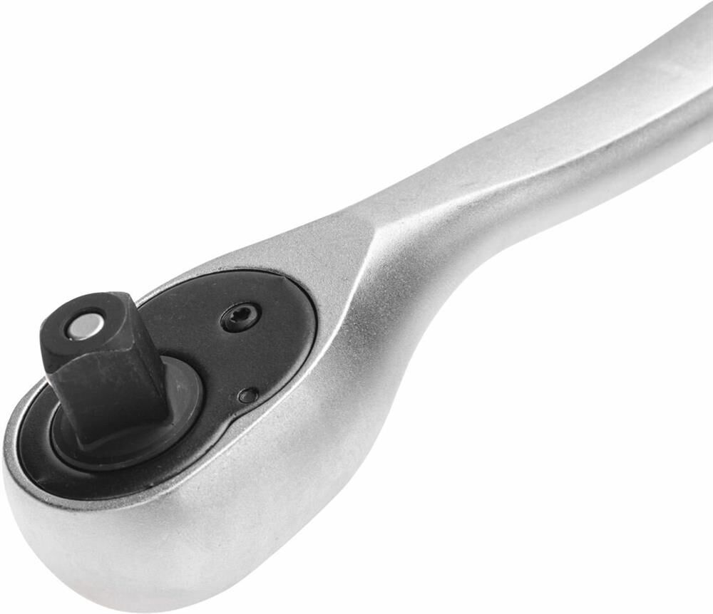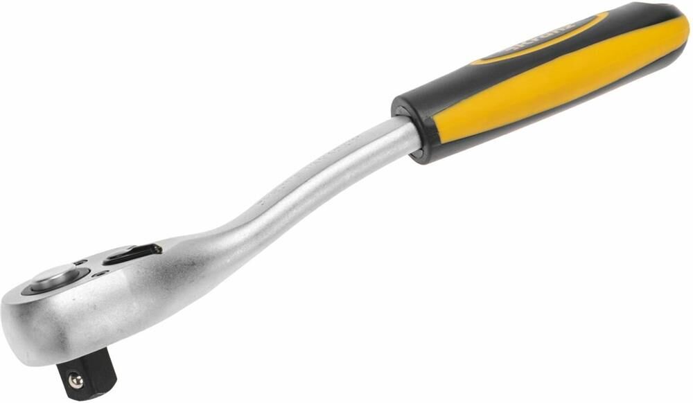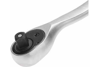 Ключ-трещотка для торцовых головок KRANZ предназначен для закручивания и раскручивания резьбовых соединений. Инструмент обладает высоким рабочим ресурсом. Оснащен цельнометаллическим корпусом с хромированной поверхностью. Изогнутая форма рукоятки создает дополнительное удобство при закручивании и раскручивании соединений, находящихся в труднодоступных местах. Прорезиненная рельефная рукоятка удобно лежит в руке в процессе работ. Инструмент служит для работы с торцевыми головками, которые соединяются при помощи посадочного квадрата 1/2 дюйма с подпружиненным шариковым фиксатором. Длина изделия – 260 мм. Количество зубьев – 72 шт. Материал изготовления – сталь СrV.