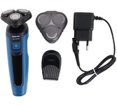 Электробритва для сухого и влажного бритья Series 5000, мощность 9Вт, роторная, Количество бритвенных секций -3, Плавающие головки, Подвижный бритвенный блок, индикатор блокировки, индикатор заряда батареи, индикатор очистки, Отсек для сбора волосков, Режимы и функции: технология SkinIQ, Возможность чистки под струей воды, Автоматическая очистка ,Дорожная блокировка, Источник питания от аккумулятора, Тип элементов питания Li-ion, Время автономной работы 60 мин, Быстрая зарядка, Подставка для зарядки, Щеточка для чистки ,Защитная крышка, Нескользящая вставка на рукоятке, Дорожный чехол , Насадки: триммер, дополнительно головки 5D Pivot & Flex. Цвет черный