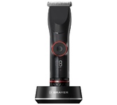 Фиксированные лезвия из высококачественной стали с титановым покрытием. Керамические подвижные лезвия. Установка длины поворотом корпуса 0.8 мм.,1.4 мм., 2.0 мм. 4 съёмные насадки 3 мм., 6 мм., 9 мм., 12 мм. Литиевая батарея 1*700мАч. Турборежим. Время заряда батареи 1,5 часа. Время непрерывной работы 1 час. LED-дисплей. Поворот базы на 360°С. Индикация уровня заряда. Индикатор включения блокировки. Возможность работы от сети и от аккумулятора. Удобная подставка для подзарядки и хранения. Аксессуары: щёточка, смазочное масло. Мощность 3 Вт. Электропитание: 220-240 В., ~50-60 Гц.