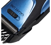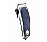 Стальные лезвия, работа от сети 220-240 В, мощный мотор (7 Вт), 3-ступенчатая регулировка лезвия с помощью рычажка, кабель питания 1,8 м, в комплекте: 4 насадки (3, 6, 9 и 12 мм), расческа, ножницы, масло, кисточка для очистки. Цвет: синий/ серебро
