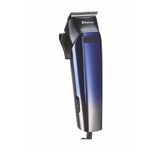 Стальные лезвия, работа от сети 220-240 В, мощный мотор (7 Вт), 3-ступенчатая регулировка лезвия с помощью рычажка, кабель питания 1,8 м, в комплекте: 4 насадки (3, 6, 9 и 12 мм), расческа, ножницы, масло, кисточка для очистки. Цвет: синий/ черный
