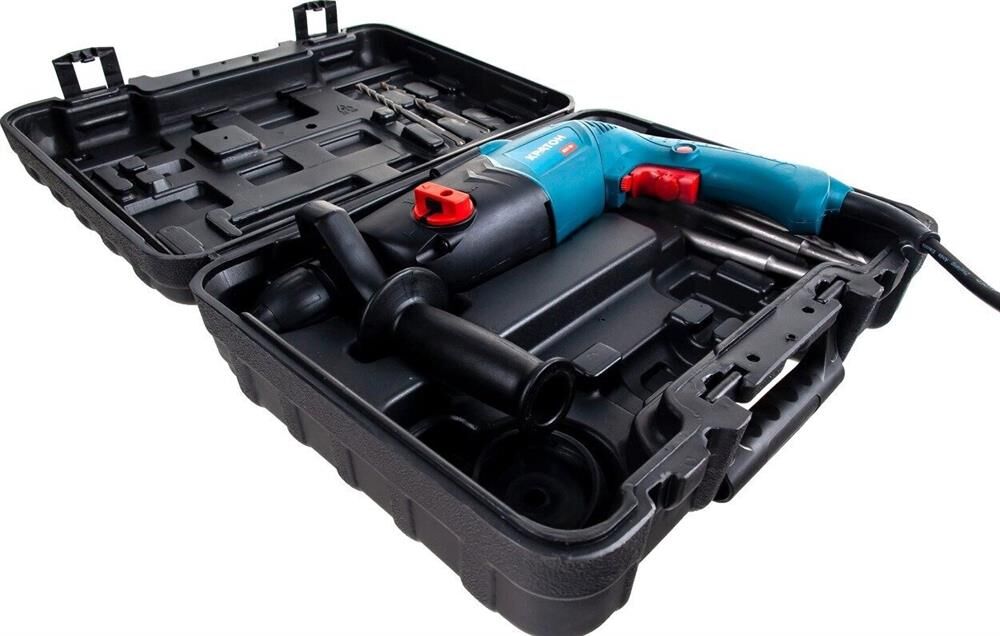 Потребляемая мощность: 850. Количество скоростей: односкоростной. Наличие функции "сверление": есть. Наличие функции "сверление с ударом": есть. Наличие функции "удар без сверления": есть. Максимальная энергия удара: 2.5. Тип основного патрона: SDS-plus. Максимальный диаметр сверления (сталь): 13. Максимальный диаметр сверления (дерево): 40. Наличие функции "реверс": есть. Наличие предохранительной муфты: нет. Встроенный фонарик: нет. Дополнительная рукоятка: есть. Ограничитель глубины сверления: есть. Жесткий кейс в комплекте: есть. Вес инструмента: 3.4. Длина сетевого кабеля: 2. Длина инструмента: 353. Высота инструмента: 224. Комплект поставки: Перфоратор, ограничитель глубины сверления, дополнительная рукоятка, пылезащитная насадка, бур SDS-plus 12?150 мм., бур SDS-plus 10?150 мм., бур SDS-plus 8?150 мм., зубило шестигранное SDS-plus 14?250 мм., пика шестигранная SDS-plus 14?250 мм., инструкция по эксплуатации, кейс.. Тип электропитания: от электросети. Габариты упаковки (ед) ДхШхВ: 0.38x0.12x0.3. Вес упа