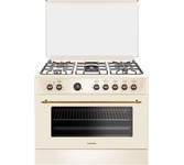 ШхГхВ: 90х60х88,5 см; 5 газовых конфорок, включая WOK-конфорку итальянского бренда SABAF; полный газ-контроль; автоподжиг; решетка: чугунная; электрическая духовка с двойной конвекцией: 110 л; 6 режимов; подсветка; электрогриль; отделение для хранения посуды; таймер ("часы") с автоотключением духовки; 2 противня, 1 хромированная решетка; крышка: стекло; цвет: бежевый