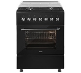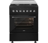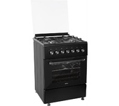 ШхГхВ: 60х60х88,5 см; 4 газовые конфорки; автоподжиг; решетка: чугунная; электрическая духовка с конвекцией: 63л; полный газ-контроль; подсветка; гриль; отделение для хранения посуды; таймер механический; цвет: черный матовый